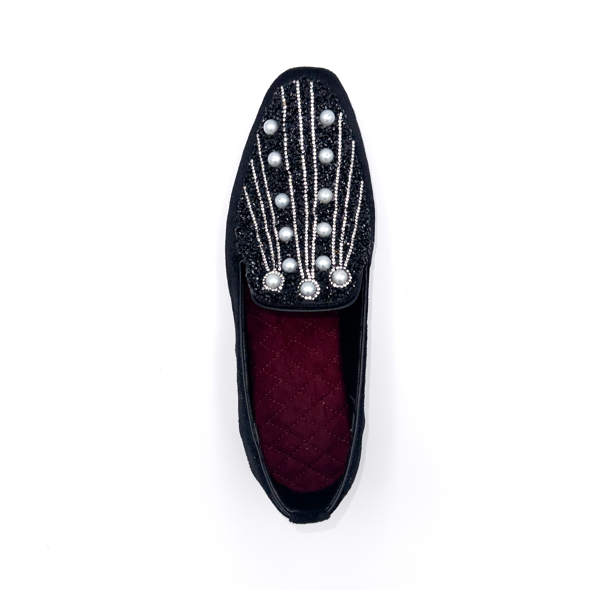 Calzado de terciopelo negro con acabado en pedrería y perlas de alta calidad. 100% hecho a mano.