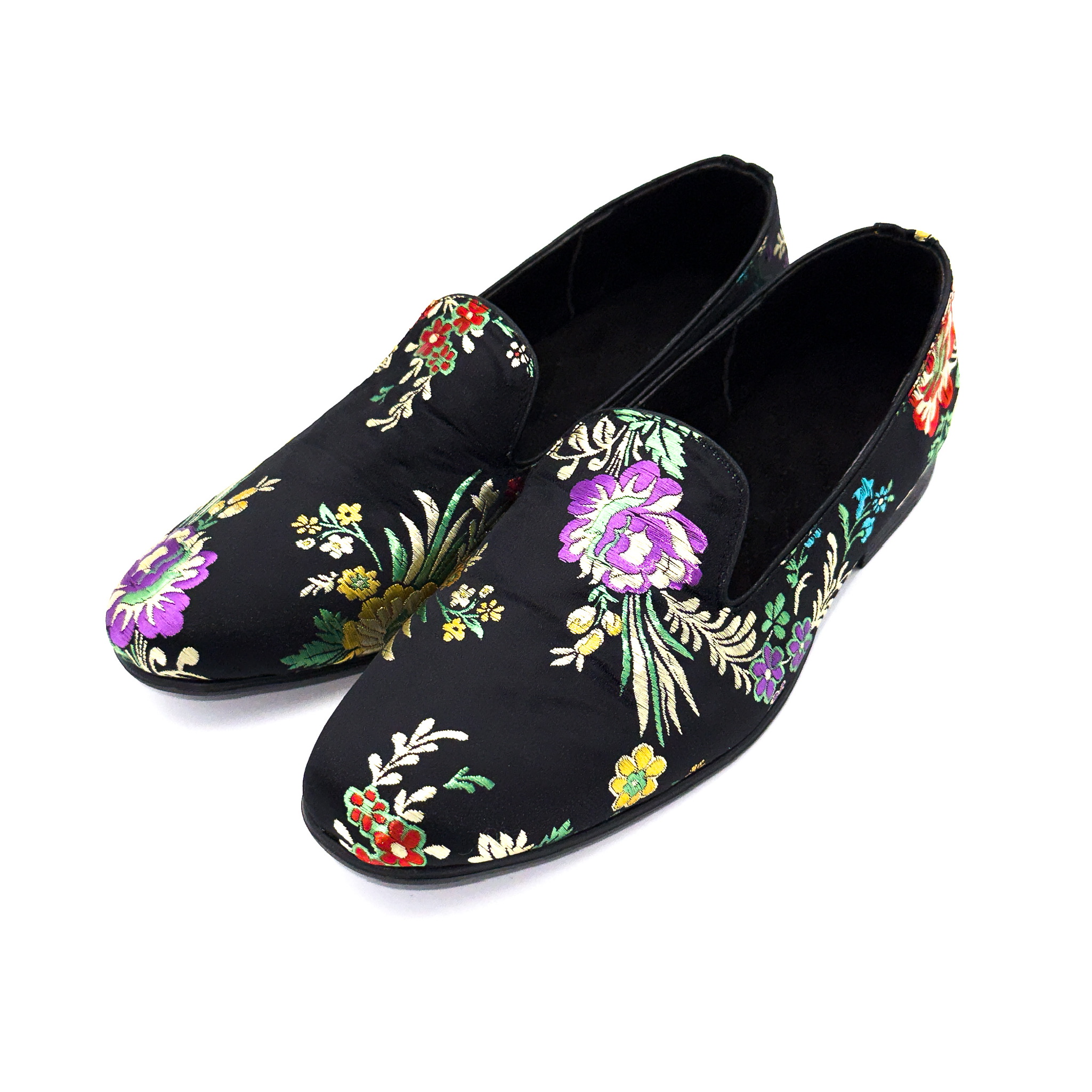 Calzado de tela satinada color negro con estampado de alta calidad de flores de colores. 100% hecho a mano.