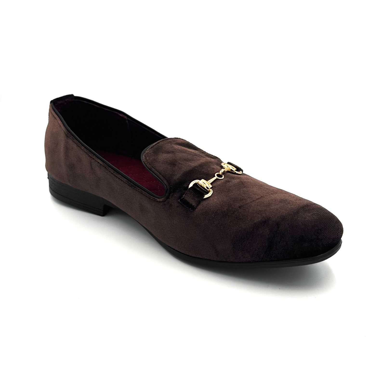 Calzado de terciopelo color café con herraje dorado de alta calidad. 100% hecho a mano.